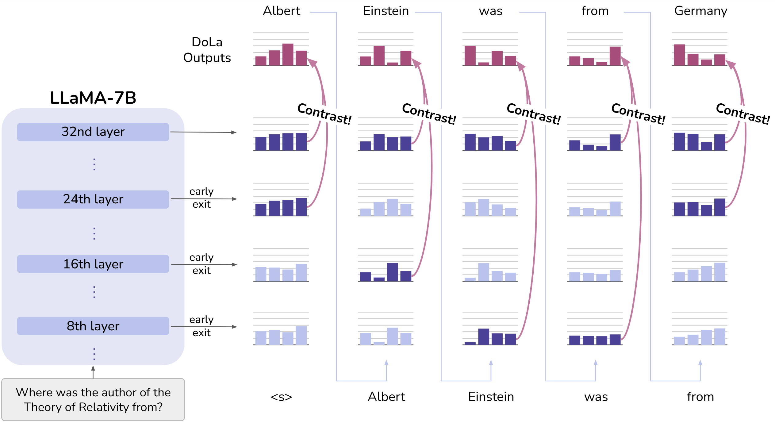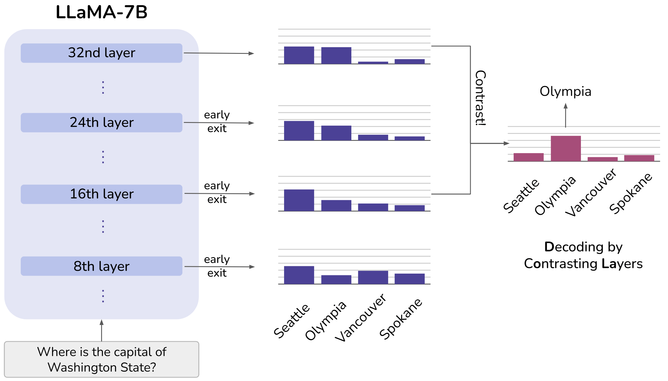 上图展示了 LLM 自底向上逐层融入事实信息的过程。具体来说,对 LLaMA-7B 的所有中间层都应用 early exit,即为所有中间层的隐藏态都添加 LM 预测头,从而得到每一层的 next token probability。由图可知,“Seattle” 在每层的概率都维持在较高水平,可能由于这是个在语法上合理的答案;而正解 “Olympia” 的概率随着 LLM 事实知识的逐层增加而逐渐增大。因此,对比不同层的预测可能揭示出正确答案。随之而来的问题是,如何选择对比层?