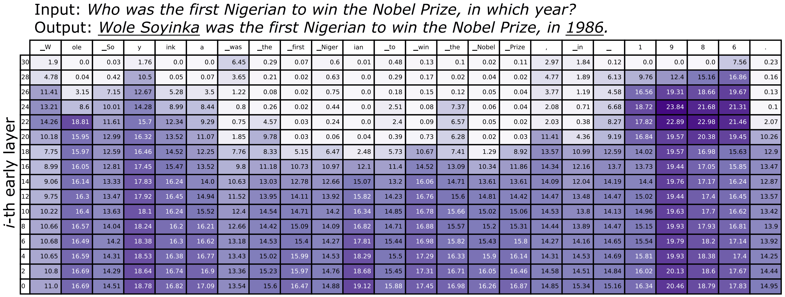 上图是最顶层(32nd layer)与其他偶数层间的 JSD,列名是每个解码步实际采样的 token。由图可知,年份 “1986”,人名实体 “Wole Soyinka” 这种事实性较强的 token,通常 premature layer(对应于与顶层间 JSD 最大,图中表现为颜色最深)位置较高;而与输入重复的词 “first Nigerian”, “Nobel Prize”,以及功能性词 “was”, “the”, “to”, “in” 等,通常 premature layer 位置较低。
