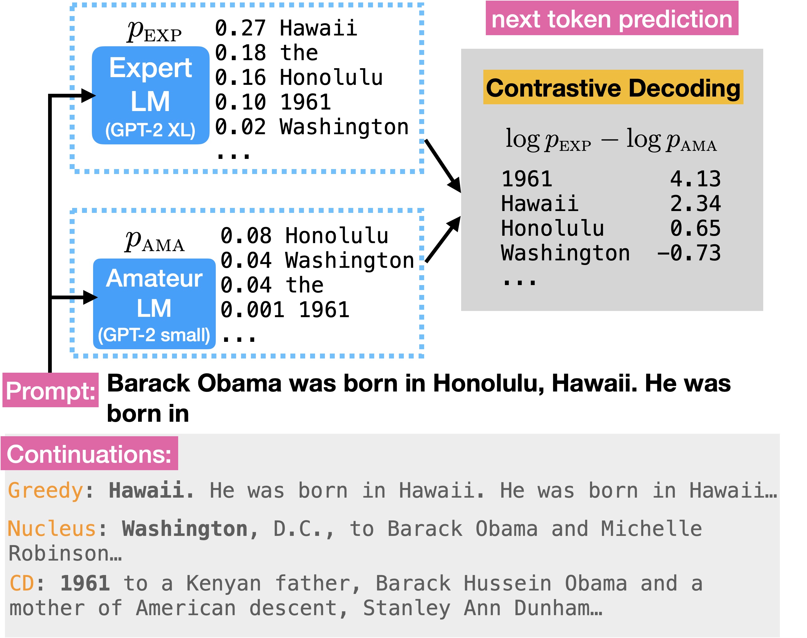 图中的专家业余模型分别为 GPT-2 XL 与 GPT-2 small。给定同一输入 prompt,两个模型分别计算 next token 的概率分布,再计算对比解码的分数。首先人工分析我们期待的模型输出,由于输入 prompt 已经给出了 Obama 出生的地区,显然我们不想让模型重复输出这一已知信息。