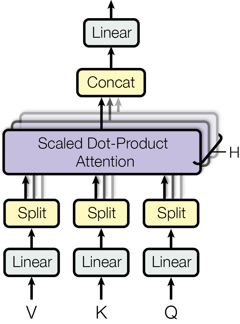 # calculate q, k, v for all heads in batch # (B, T, C) -> (B, T, 3C) -> (B, T, C) x 3 q, k, v = self.c_attn(x).split(C, dim=-1) # move head dim forward to be the batch dim # (B, T, C) -> (B, T, nh, hs) -> (B, nh, T, hs) # C = nh * hs, where nh: number of heads, hs: head size, q = q.view(B, T, self.n_head, C // self.n_head).transpose(1, 2) k = k.view(B, T, self.n_head, C // self.n_head).transpose(1, 2) v = v.view(B, T, self.n_head, C // self.n_head).transpose(1, 2)